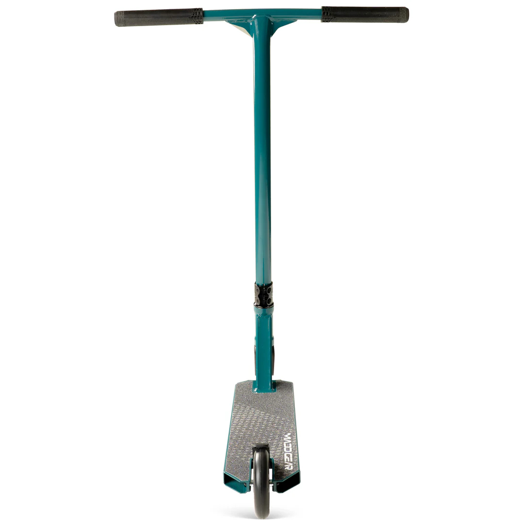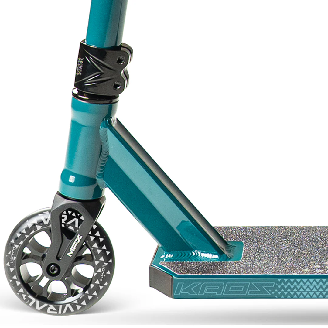 Kolo Madd Gear Viral Kaos poskytuje stabilní a lehkou platformu pro triky. 110mm kolečka MG Syndicate s ložisky ABEC-11 zajišťují plynulou jízdu vysokou rychlostí, zatímco jednodílná hliníková řídítka T-Bar poskytují kontrolu a páku potřebnou pro působivé triky.